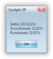 Zu sehen ist jeweils eine Meldung der Zwischenzeitsensoren. Bei Sektor 1 wird zusätzlich kurz gewartet und dann die Zwischenzeiten zurückgesetzt. Im Anschluss ergibt sich eine weitere Meldung, die den aktuellen Wert von Cockpit.Sektorzeit und Cockpit.Zwischenzeit anzeigt.