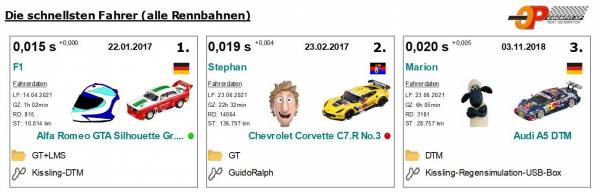 - Fahrerdaten: LF (letzter Lauf), GZ (Gesamtfahrzeit), RD (gefahrene Runden), ST (gefahrene Strecken)