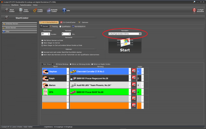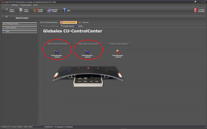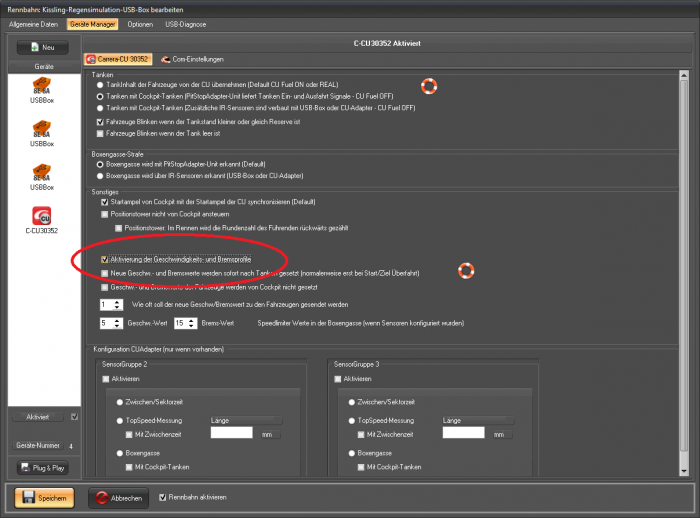Hier muss ein Häkchen bei Aktivierung der Geschwindigkeits- und Bremsprofile gesetzt werden. Erst dann lässt im CU-ControlCenter die „Kurve“ programmieren. Ganz wichtig, es muss im StartCenter auch die aktivierte Bahn ausgewählt sein !!!