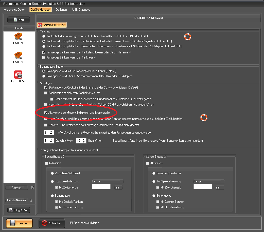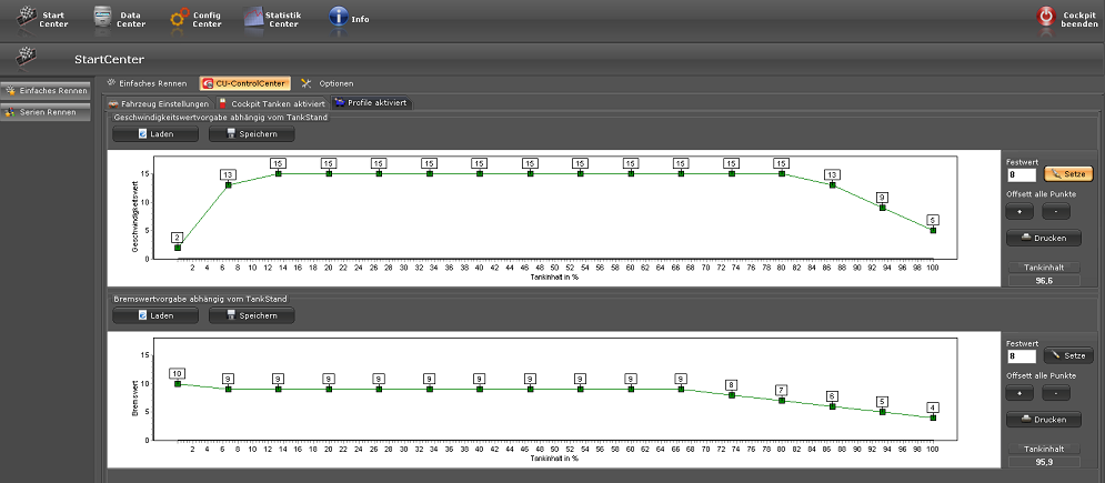 Es gibt bei Cockpit XP die Möglichkeit, die Geschwindigkeit und die Bremse in Abhängigkeit vom Tankinhalt zu konfigurieren. Damit man diese Funktion verwenden kann, muss man in der Bahnkonfiguration die Funktion aktivieren, erst dann kann man über das CU-Center die Profile konfigurieren.