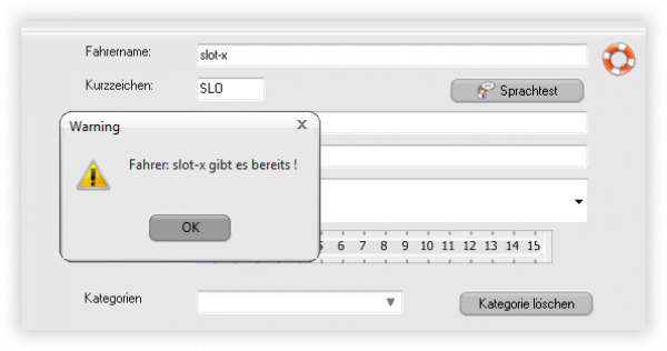 Das einzige „Mussfeld“ ist der Fahrername. Dieser darf nur 1x vorkommen und muss entsprechend eindeutig sein. 2x der gleiche Name führt zu einer Fehlermeldung beim Versuch, den Datensatz zu speichern.