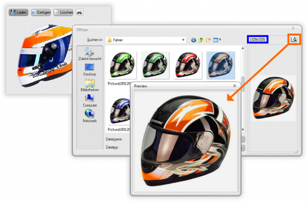 Ein indiviuelles Bild gelangt auf zwei möglichen Wegen in Cockpit-XP. Entweder befindet es sich bereits auf einem Datenträger. In diesem Fall klickt man auf den Laden-Button über dem Bildfenster. Es öffnet sich der in Windows vorhandene Dialog zur Auswahl einer Datei. Einfach zum gewünschten Ordner navigieren, das Bild anklicken und anschließend über den Öffnen-Button in den Fahrerdatensatz laden.