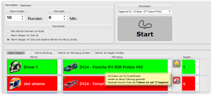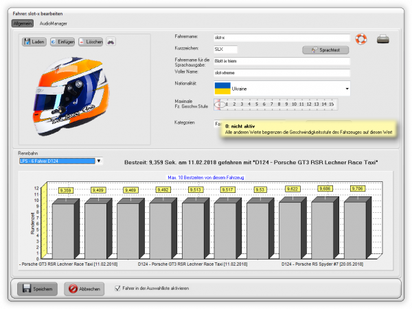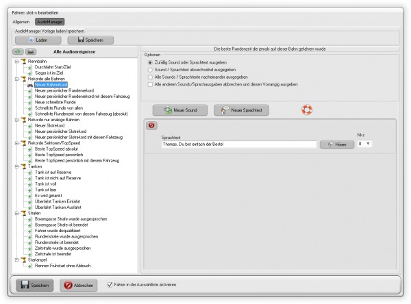 Ins Feld Fahrername für die Sprachausgabe gehört der Name so, wie die Stimme des Betriebssystems ihn aussprechen soll. Eine auf deutsch ausgelegte Stimme würde „„slot-xtreme““ eher bescheiden klingen lassen. Er wäre im Verlauf eines Rennens wahrscheinlich kaum wahrzunehmen. Wie ich meinen Namen aussprechen lasse, seht ihr im Bild oben.